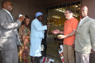 Stakeholders feeling local trading: DTI Thami Klassen, Walk-in-25 Management Basil Manganadelis Her Worship Mayor, Cllr Maria Mokobodi, Secondary co-op Treasurer Jane Manakana and society members.